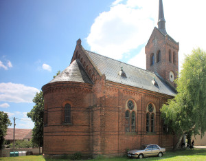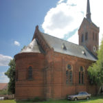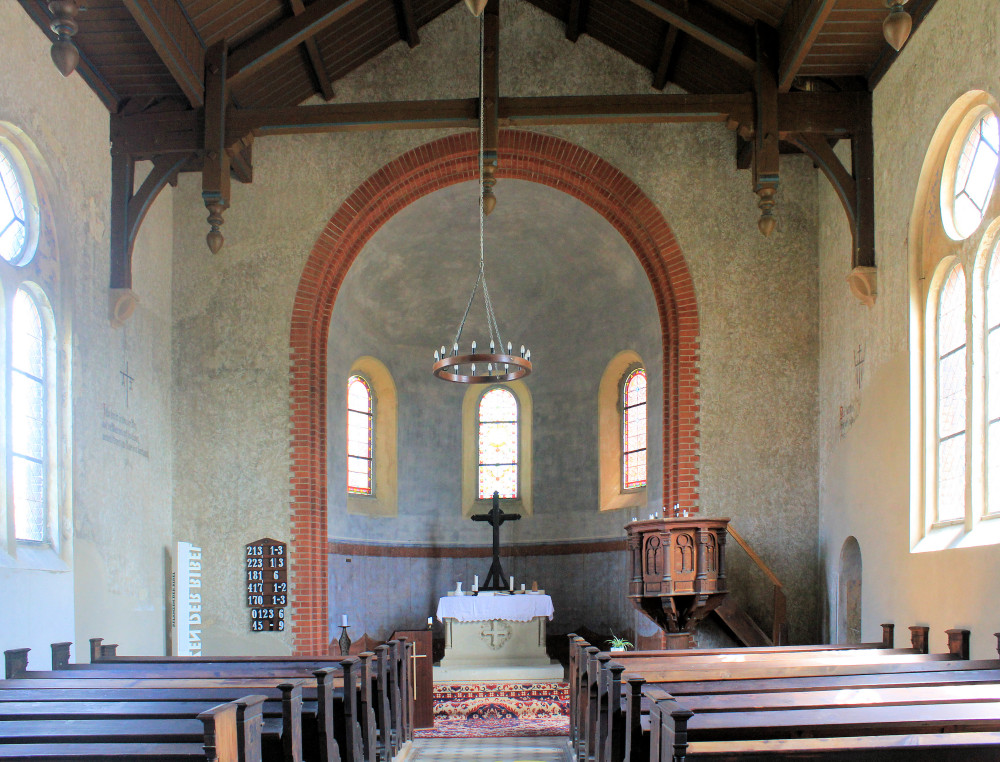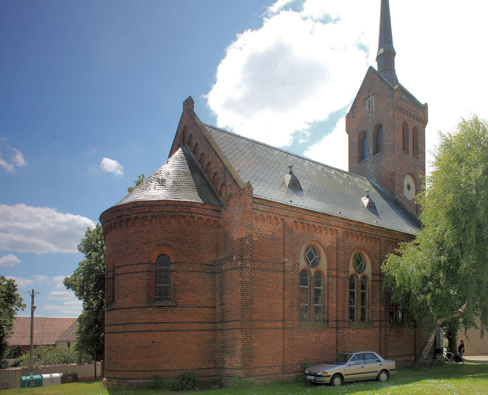 - Klinkerbau, gerader Ostschluss, Apsis, Sakristei, Rund- und Spitzbogenfriese, Rundbogenfenster mit einfachem Maßwerk, eingestellter Westturm mit Satteldach und Spitzhaube