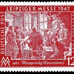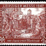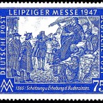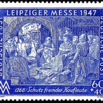 Im Jahr 1947 ist die Leipziger Messe erstmals nach dem 2. Weltkrieg Thema auf Briefmarken, die in allen vier Besatzungszonen herausgegeben wurden. Die Marken zur Frühjahrmesse zeigen die Verleihung des Marktrechts (hier 1160 datiert) und die Verleihung des Geleitschutzbriefes 1168.