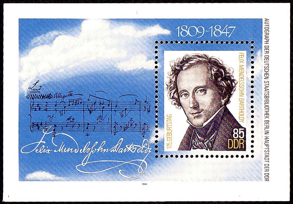 Die Deutsche Post der DDR gab zum 150. Geburtstag von Felix Mendelssohn-Bartholdy im Jahr 1959 zwei Briefmarken mit der Ansicht des alten Gewandhauses und einem Notenblatt heraus. Zu seinem 175. Geburtstag 1984 erschien ein Block mit der Darstellung von Mendelssohn-Bartholdy.