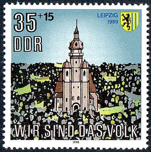 Die Deutsche Post der DDR gab 1990 eine Briefmarke mit der Nikolaikirche und dem Satz „Wir sind das Volk“ zur Erinnerung an die friedliche Demonstration in Leipzig heraus.