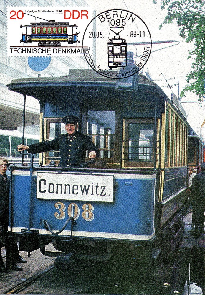 1986 gab die Deutsche Post der DDR eine Briefmarkenreihe „Technische Denkmale“ heraus, darunter mit der Darstellung der Leipziger Straßenbahn von 1896.
