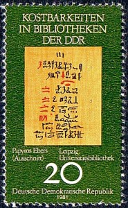 Dier Deutsche Post der DDR gab 1981 eine Briefmarkenserie mit Kostbarkeiten in Bibliotheken der DDR heraus, darunter ein Papyrus aus der Leipziger Universitätsbibliothek.