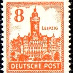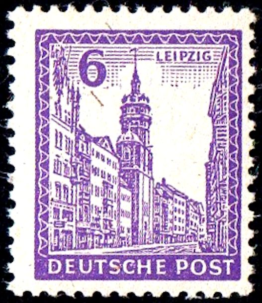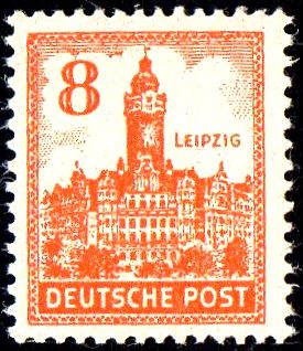 Nach den Zerstörungen des 2. Weltkrieges begann auch in Leipzig der Wiederaufbau. Die Deutsche Post in der Sowjetischen Besatzungszone gab drei Briefmarken mit der Darstellung der Nikolaikirche, dem Neuen Rathaus und dem Stadtwappen von Leipzig heraus.