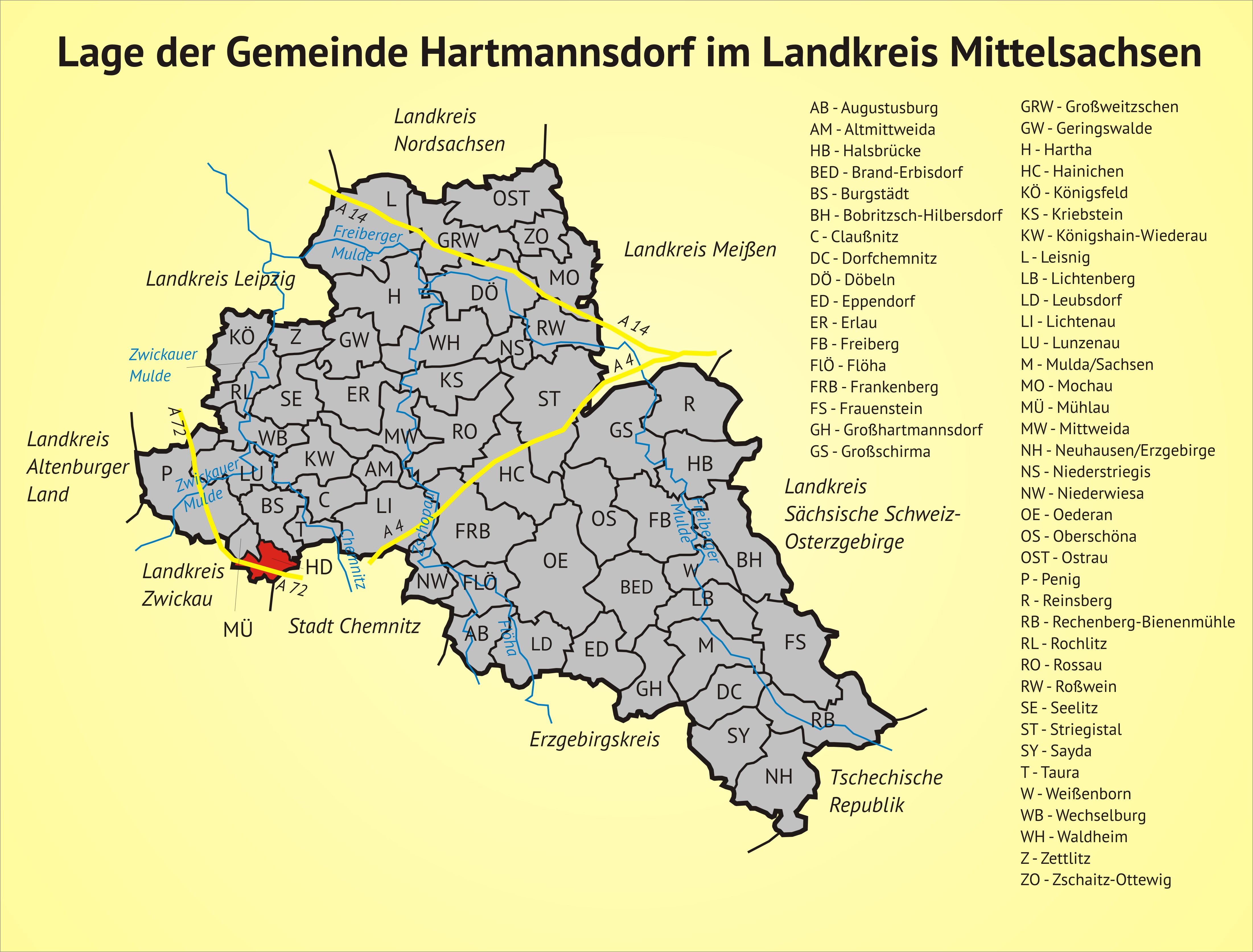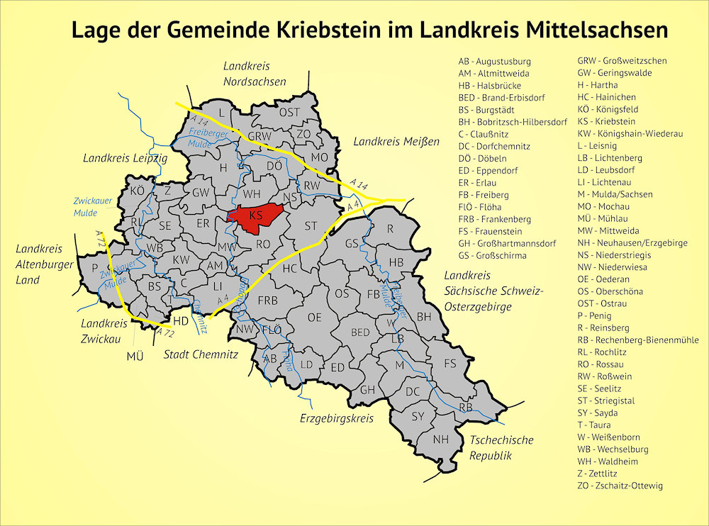 Der Landkreis Mittelsachsen erstreckt sich zwischen dem Südraum Leipzig im Nordwesten des Freistaats Sachsen bis an die Grenze zur Tschechischen Republik südwestlich von Dresden. Der Landkreis Mittelsachsen entstand im Jahr 2008 aus den Landkreisen Döbeln, Freiberg und Mittweida. Auf einer Fläche von ca. 2.116 km² leben ca. 312.000 Menschen (Stand 31.12.2015).