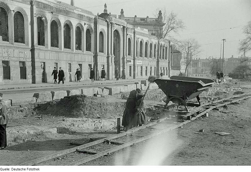 Trümmerfrauen nach dem Kriegsende auf der Schillerstraße vor dem zerstörten Fridericianum der Universität Leipzig