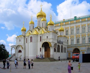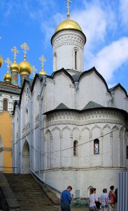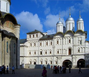 Mariä-Verkündigungs-KathedraleEinen weiterer historischer Kirchenbau auf dem Kathedralenplatz des Kremls ist die Mariä-Verkündigungs-Kathedrale. Um 1291 entstand an der gleichen Stelle vermutlich erstmals eine Holzkirche, die dem orthodoxen Fest der Mariä Verkündigung geweiht wurde. Im 14. Jahrhundert brannte sie ab und wurde durch eine steinerne Kirche ersetzt, die wiederum gegen Ende des 15. Jahrhunderts abgetragen wurde. Der Bau der heutigen Kathedrale wurde 1489 abgeschlossen. Da sich schon damals in unmittelbarer Nähe des Gotteshauses, an Stelle des heutigen Großen Kremlpalastes, Gemächer der Moskauer Großfürsten befanden, nutzten dieser die Verkündigungskathedrale als Hauskirche und ließ dazu eine Übergangsgalerie vom Palais direkt in die Kathedrale errichten. Mitte des 16. Jahrhunderts wurde das Gotteshaus auf Geheiß Iwan des Schrecklichen, des ersten gekrönten russischen Zaren, erheblich ausgebaut. Noch bis zum Bau des Terem-Palastes in den Jahren 1635 bis 1636 diente die Mariä-Verkündigungs-Kathedrale den Zaren als Hauskirche. Mariä-Gewandniederlegungs-Kirche