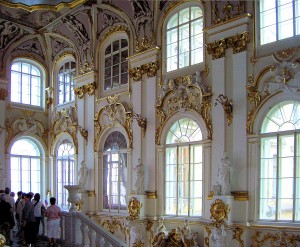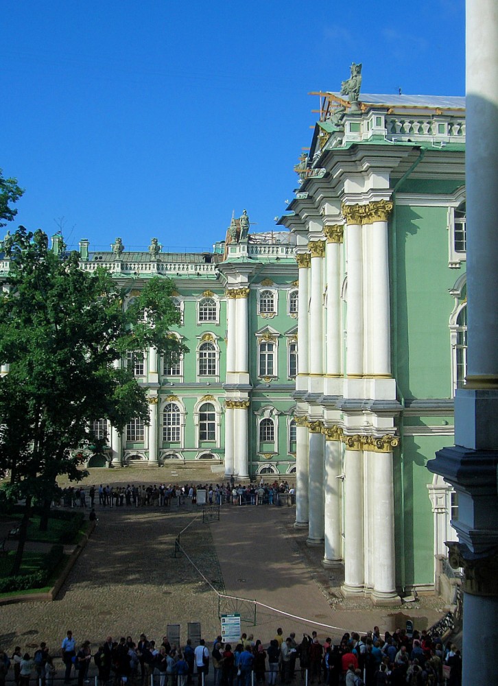 1754 begann der Bau des Winterpalastes in St. Petersburg. 1712 erklärte Zar Peter der Große Sankt Petersburg anstelle von Moskau zur Hauptstadt des Russischen Zarentums. Ab 1721 war St. Petersburg Hauptstadt des Russischen Kaiserreichs). Bis auf die Jahre 1728 bis 1732, als der Hof in Moskau weilte, blieb St. Petersburg Hauptstadt Russlands bis 1918. Beim Adel stieß die Maßnahme auf wenig Begeisterung, nur ungern gab man die bequemen Wohnsitze in Moskau auf. Die neue Residenz brauchte auch einen neuen Palast. 1762 stellte der Architekt Batolomeo Francesco Rastrelli den Bau an der Newa fertig. Den prächtigen Palast mit seiner barocken Fassade zieren weiße Säulen, Statuen und vergoldeten Kapitelle und erzeugen einen Kontrast zum grünen Hintergrund. Nach dem Bau der Zarenresidenz, fügte Katharina die Große, die eine leidenschaftliche Kunstsammlerin war, die Kleine Eremitage und später die Große Eremitage für ihre Kunstsammlungen hinzu. Als letztes Gebäude entstand die Neue Eremitage. Zar Nikolaus I. machte die Neue sowie die Große Eremitage zum Museum. Im Jahr 1917 begann auf dem Schlossplatz vor dem Winterpalais die russische Oktoberrevolution. Unter Lenins Führung stürmten Bolschewiken und Matrosen den Winterpalast. Der ehemalige Winterpalast der Zaren ist heute eines der berühmtesten Kunstmuseen der Welt. Nach dem Ende der Zarenherrschaft 1918 wurde auch der Winterpalast allmählich zum Museum. In der Großen Eremitage, die von Juri Velten entworfen wurde, findet man heute hauptsächlich die Gemäldesammlungen von Katharina der Großen. Die Prunksäle befinden sich hauptsächlich im Winterpalast. Das Eremitage-Museum ist eines der ältesten und zugleich größten der Welt. Es ist in fünf historischen Palästen untergebracht. (Kleine Eremitage, Große Eremitage, Neue Eremitage, Eremitage-Theater und Winterpalast, die einstige Zarenresidenz).In den Sammlungen werden über 3 Millionen Ausstellungsstücke von der prähistorischen bis zur modernen Zeitgezeigt und dass in insgesamt 400 prachtvollen Räumen. Zu den Kunstsammlungen zählen 2500 Gemälde von berühmten Künstler wie da Vinci, Cezanne, Picasso, Monet, van Gogh usw., geschliffene Edelsteine, verzierte Uhren, Gold, Silber, Porzellan, Statuen, antike Vasen, über 90.000 große Münz -und Medaillensammlung, Kleidung der Zaren, Trohnstühle, Zarenkutschen, Waffensammlungen und vieles mehr.