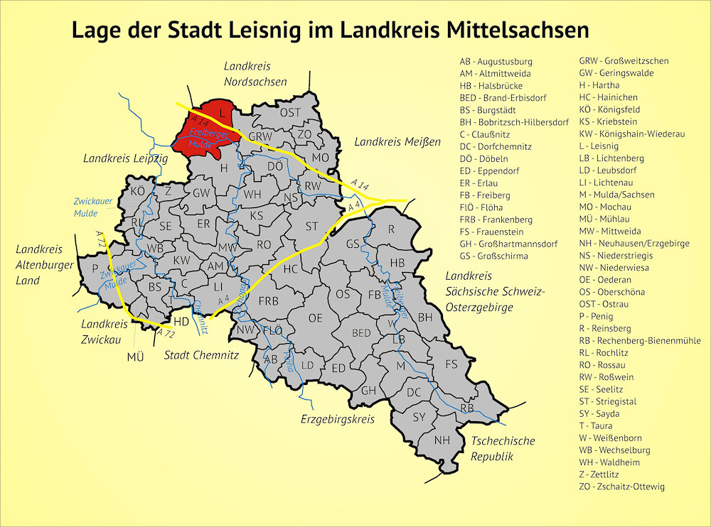 Leisnig ist eine Kleinstadt im Norden des Landkreises Mittelsachsen. Die Stadt Leisnig setzt sich aus den folgenden Ortsteilen zusammen: