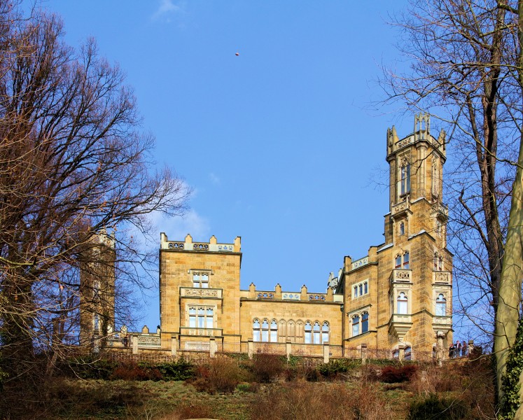 - über dem Hochufer der Elbe auf einem Bergsporn in Anlehnung an eine mittelalterliche Burg errichteter Bau, langgestreckter, unregelmäßiger Baukörper,