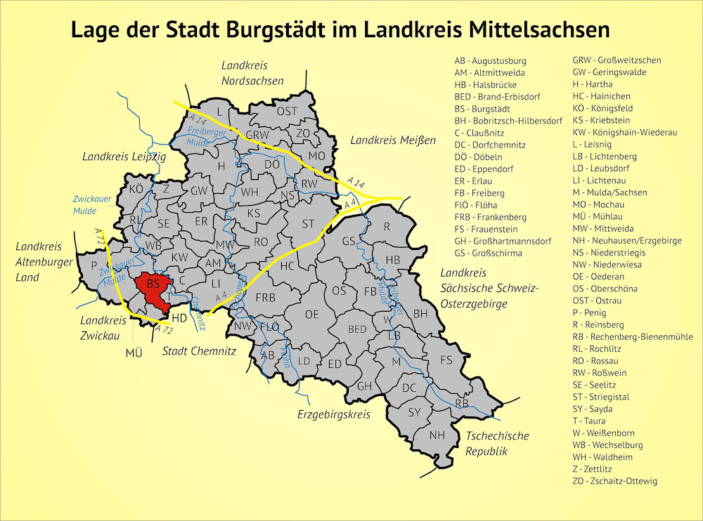 Lage der Stadt Burgstädt im Landkreis Mittelsachsen