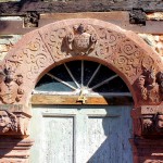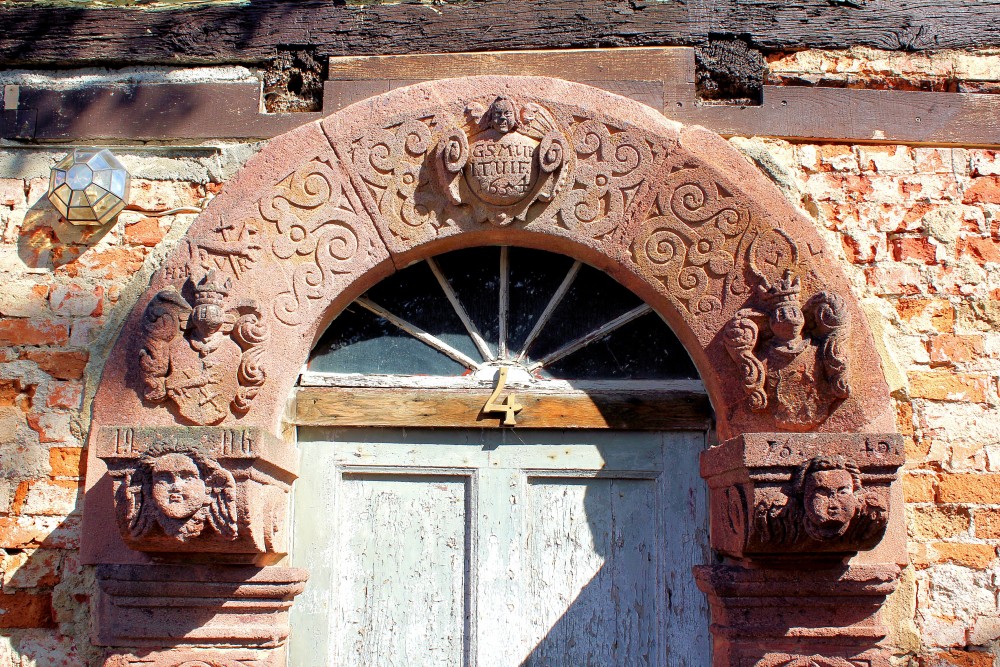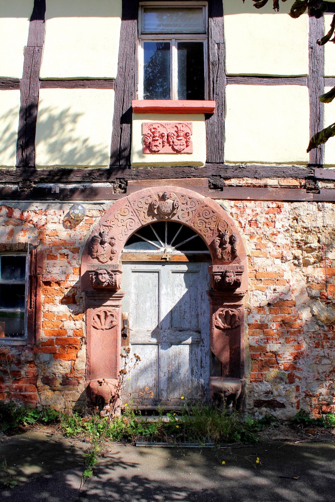- Erdgeschoss ursprünglich verputzt, Obergeschoss Sichtfachwerk, Sitznischenportal aus Porphyr,