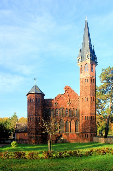 - Klinkerbau, Ostseite mit zwei Achtecktürmen und dazwischenliegendem Ruinengiebel, spitzbogige Blendbögen, Spitzbogenfenster mit Halbsäulen, fünfgeschossiger Nordostturm mit vier Erkertürmchen,