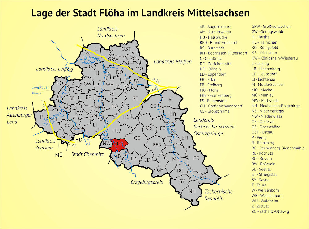 Flöha ist eine Große Kreisstadt im Westen des Landkreises Mittelsachsen. Die Stadt Flöha setzt sich aus den folgenden Ortsteilen zusammen:- Bernsdorf,