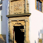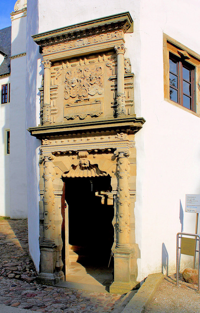 - dreigeschossig, Treppenturm mit aufwändig gestaltetem Portal,