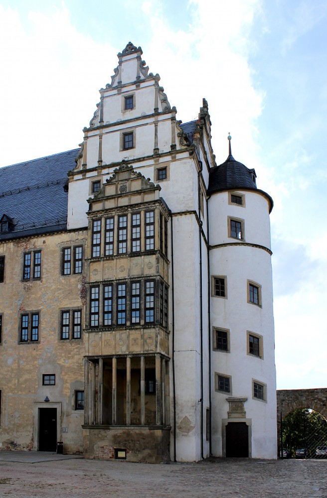 - dreigeschossig, Zwerchhäuser, auf der Hofseite Treppenturm mit reich geschmücktem Portal