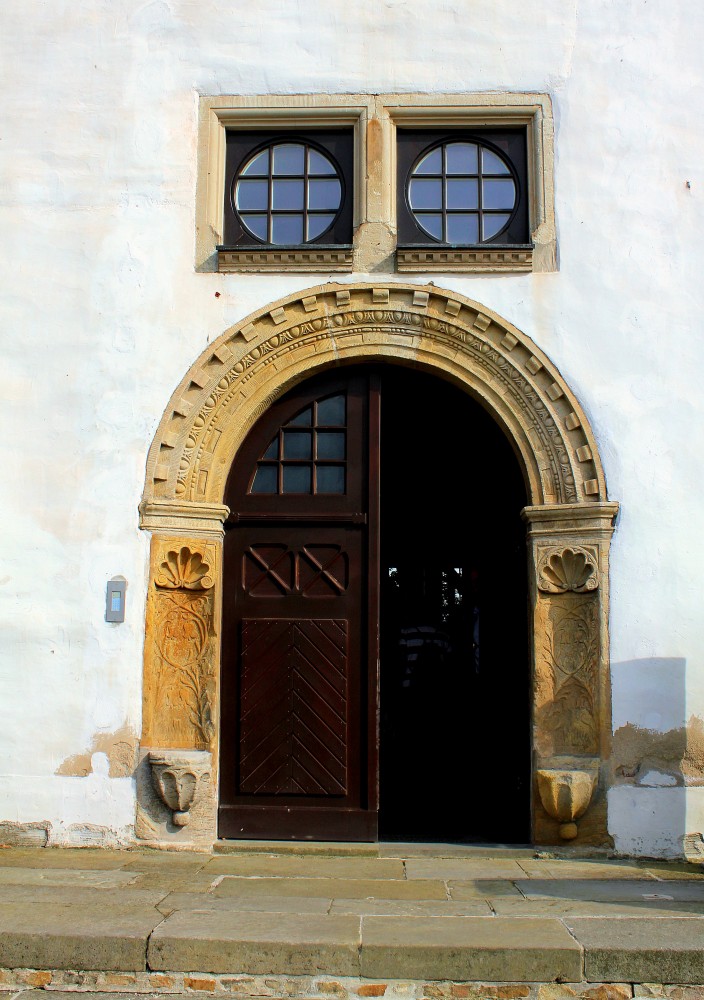 - Putzfassade, schlichte Gestaltung mit profilierten Gewänden, reich geschmückter Erker