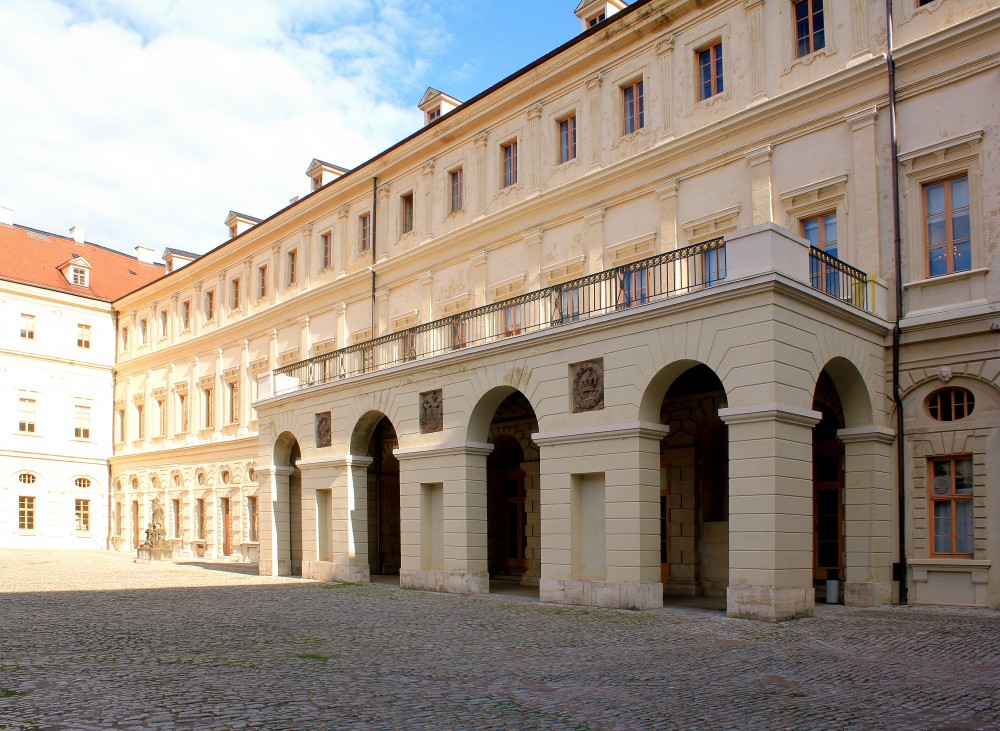 Hoffassaden: Erdgeschoss Blendarkaden in Putzquaderung, Obergeschosse mit Pilasterordnung, zwei Altane, - Dachform