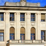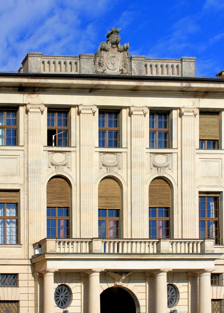 Südflügel: sandsteinverkleidet, zweigeschossige Kolossalordnung mit kannelierten Pilastern, Betonung der drei Mittelachsen durch Altan,