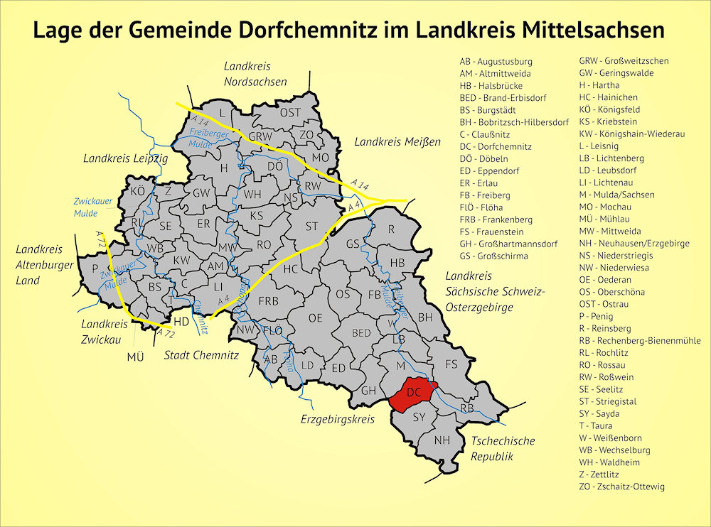 Dorfchemnitz ist eine Gemeinde im Süden des Landkreises Mittelsachsen. Die Gemeinde Dorfchemnitz setzt sich aus den folgenden Ortsteilen zusammen:- Dorfchemnitz,