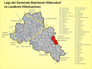 Bobritzsch-Hilbersdorf ist eine Gemeinde im Osten des Landkreises Mittelsachsen. Die Gemeinde Bobritzsch-Hilbersdorf setzt sich aus den folgenden Ortsteilen zusammen: