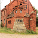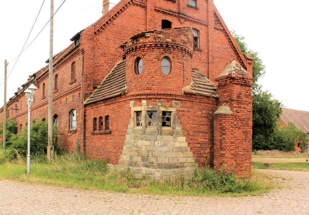Wirtschaftsgebäude: Klinkerfassaden mit Zierelementen, Zufahrt mit bastionsartigen Türmen - Dachform