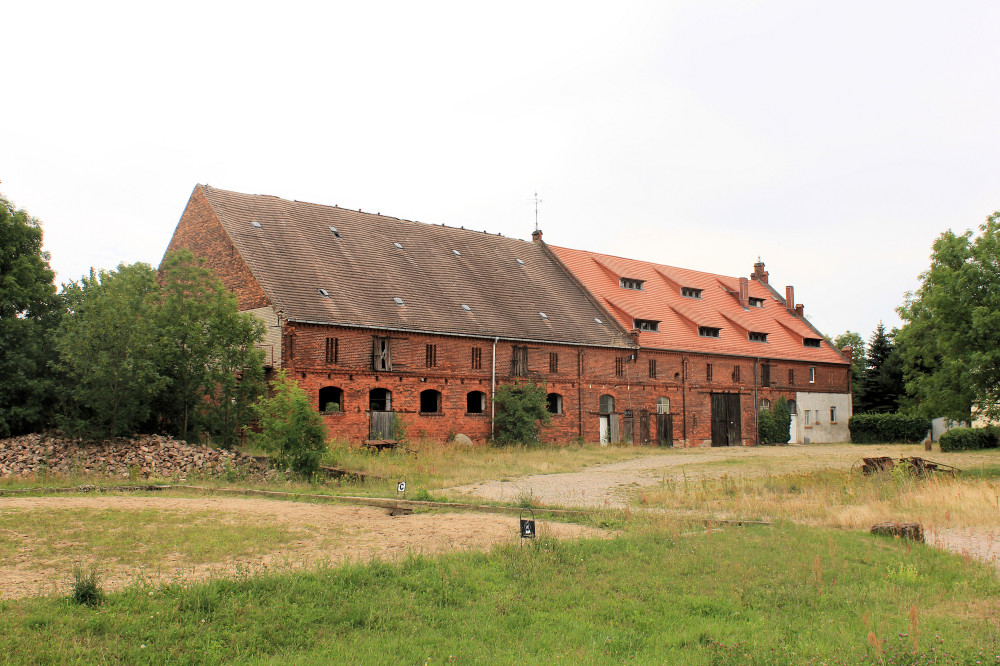 - sehr großer, unregelmäßiger Gutshof, bestehend aus einem etwa quadratischen Kernhof mit dem langgestreckten Herrenhaus, nach Norden erweitert, westlich Wohngebäude