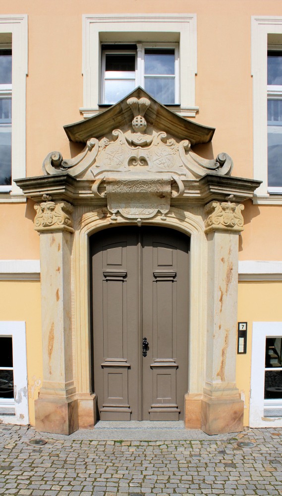 - sehr zurückhaltend, Portal mit den Wappen der Familien von Pflugk und von Lindenau, deutlich hervorspringende Mittelrisalite, auf der Hofseite zweiläufige, geschwungene Treppe, nur am Altan Stuckaturen
