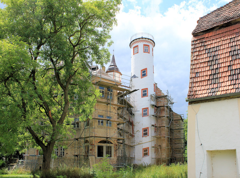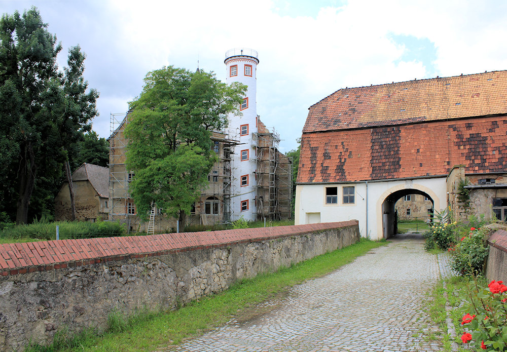 - Die Türme des Schlosses in Noschkowitz sind saniert. Das Torhaus ist in einem guten Zustand, die Wirtschaftsgebäude sind schadhaft bis ruinös. Das Schloss ist in Sanierung (August 2016).