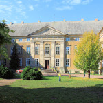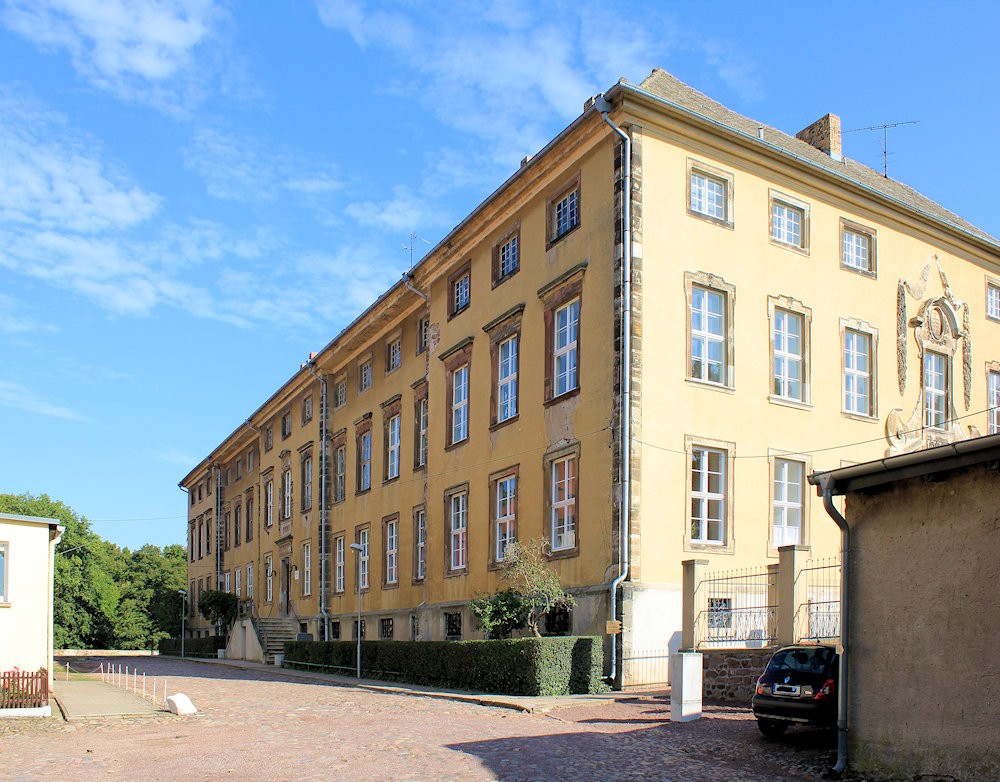 - Schloss: Putzfassade, 17-achsisge Hoffassade, dreiachsige Mittel- und Seitenrisalite, Eckrustizierung, Mittelrisalit mit Kolossalpilastern und Dreiecksgiebel, geschwungene Freitreppe