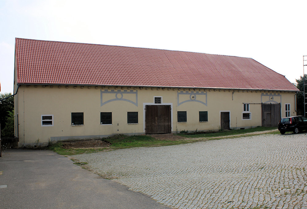 - Herrenhaus: Putzfassade, Mittelrisalite mit Dreiecksgiebeln, Fensterverdachungen