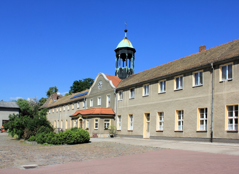 - Herrenhaus: zweigeschossig, 29 Achsen, dreiachsige Eckpavillons, dreiachsiger Mittelrisalit, auf der Parkseite dreigeschossig mit Dreiecksgiebel und Freitreppe, auf der Hofseite mit Schweifgiebel, Laterne, Vorbau auf der Hofseite