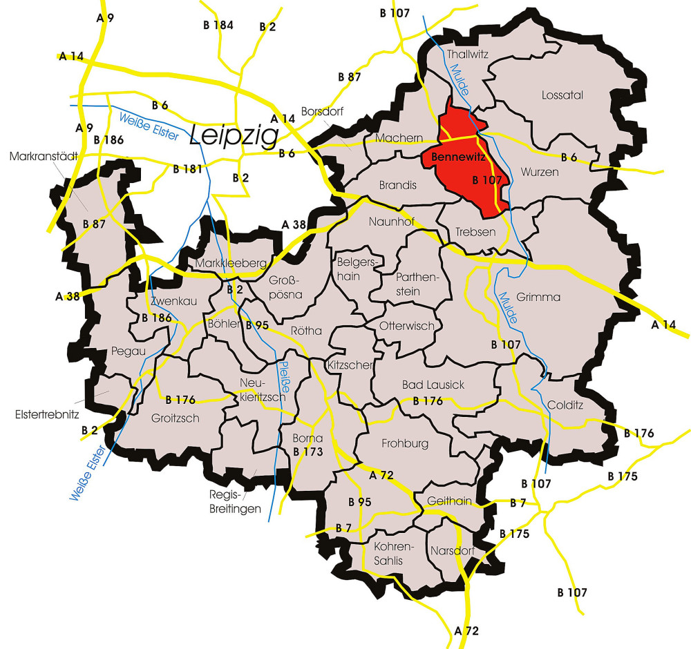 Bennewitz ist eine Gemeinde im Norden des Landkreises Leipzig zwischen Leipzig und Wurzen. Die Gemeinde Bennewitz besteht aus den Ortsteilen:- Altenbach,