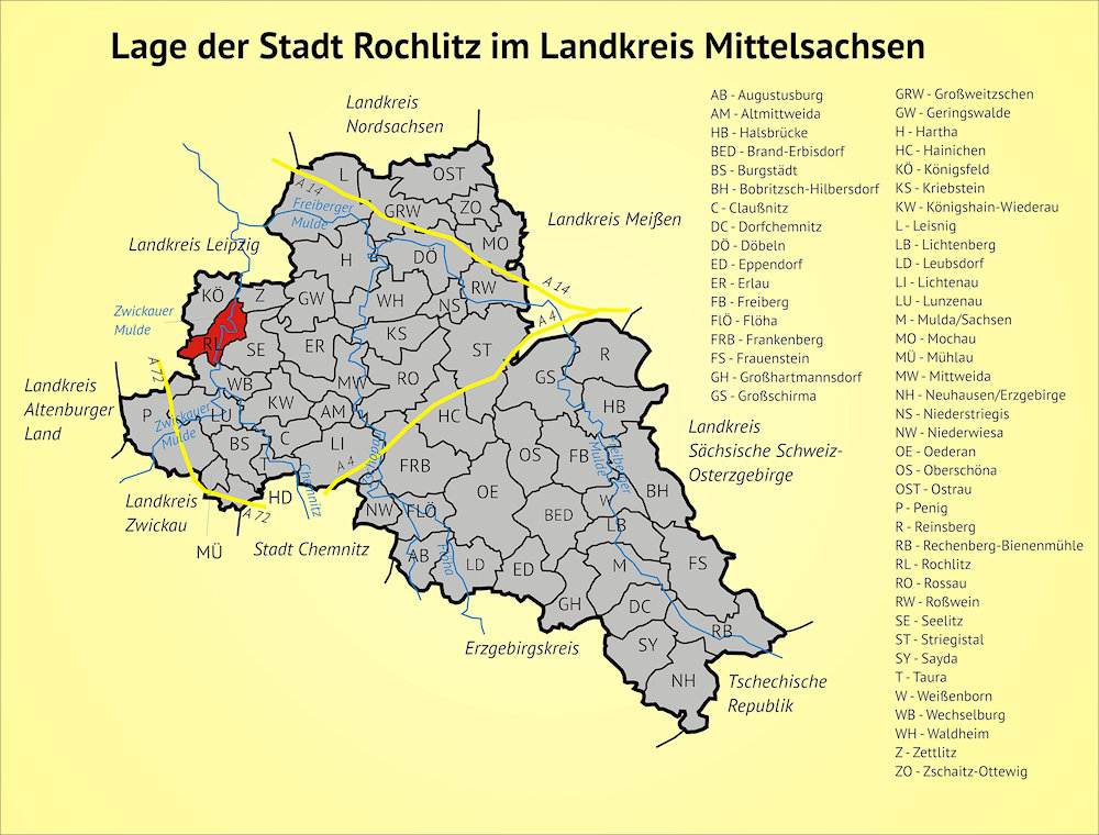Rochlitz ist eine Kleinstadt im Nordwesten des Landkreises Mittelsachsen. Die Stadt Rochlitz setzt sich aus den folgenden Ortsteilen zusammen: