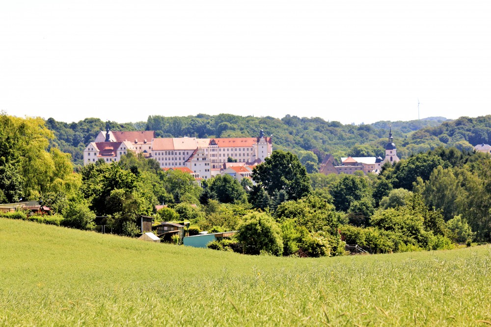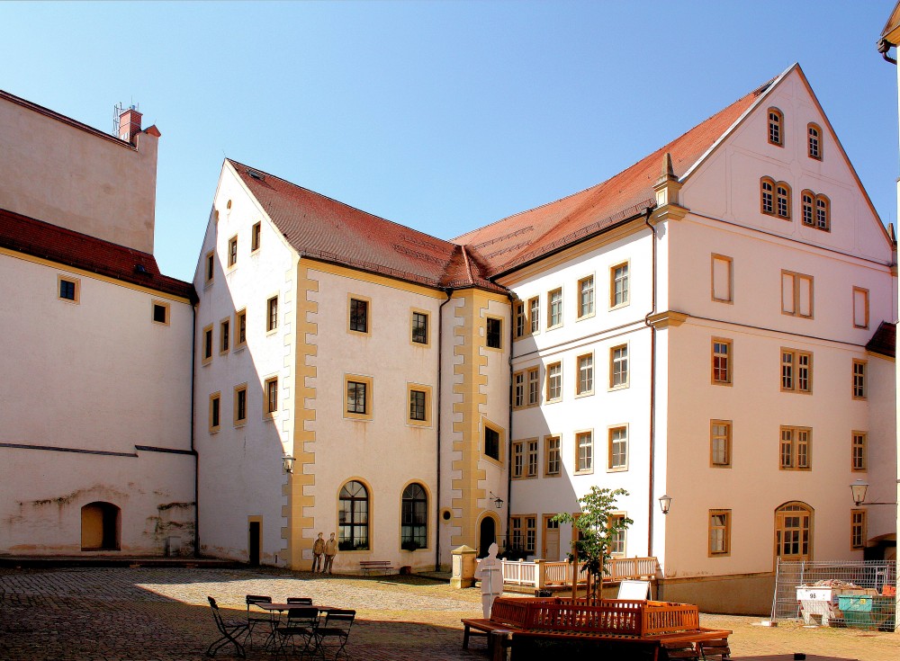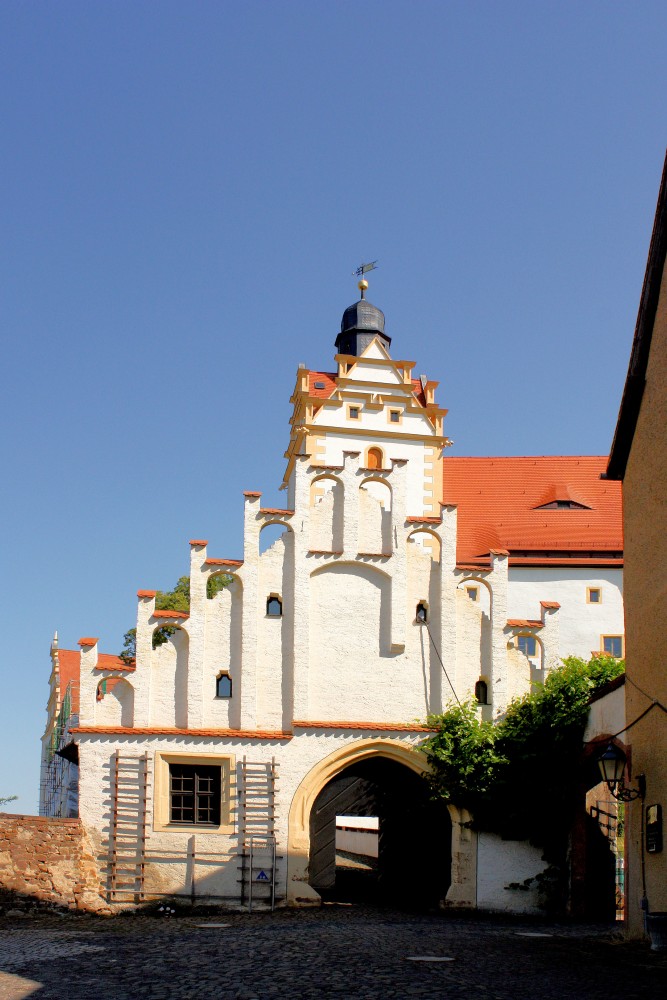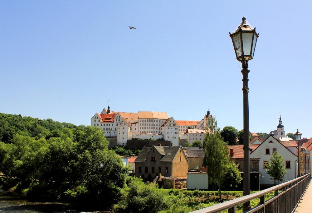 - vielgestaltige, unregelmäßige Anlage, auf einem Bergsporn über der Stadt am rechten Muldeufer gelegen, Untergliederung in Vor- und Kernschloss, das Vorschloss mit weiträumigem Hof, das Kernschloss gedrungener, Ursprung ist eine Burganlage, 1046 erstmals erwähnt, die sich im Bereich des Kernschlosses befand, markanteste Bauten sind das Fürstenhaus (um 1430), die Schlosskapelle, das Beamtenhaus (1630), der Torbau (1506) und das Torhaus (Mitte 16. Jahrhundert)