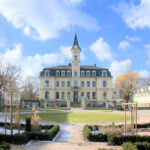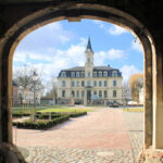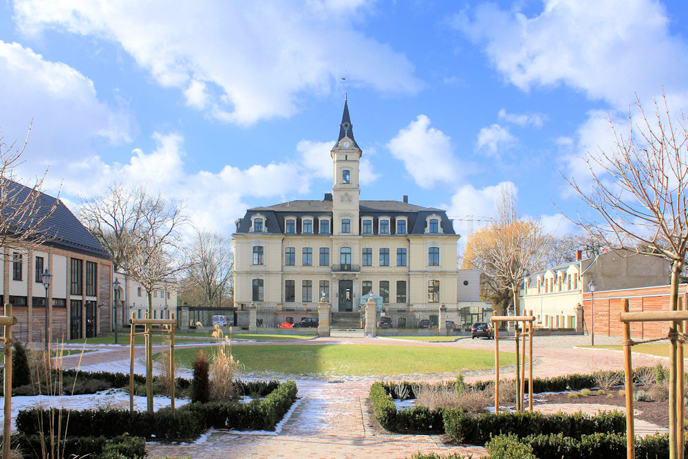 Das Schloss Schönefeld steht in einem kleinen Park.