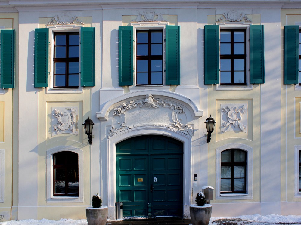 Neues Schloss: flacher Mittelrisalit an der Hauptfront, Sandsteinportal mit Rokokokartusche, Putzfelder mit Trophäendarstellungen, - Dachform