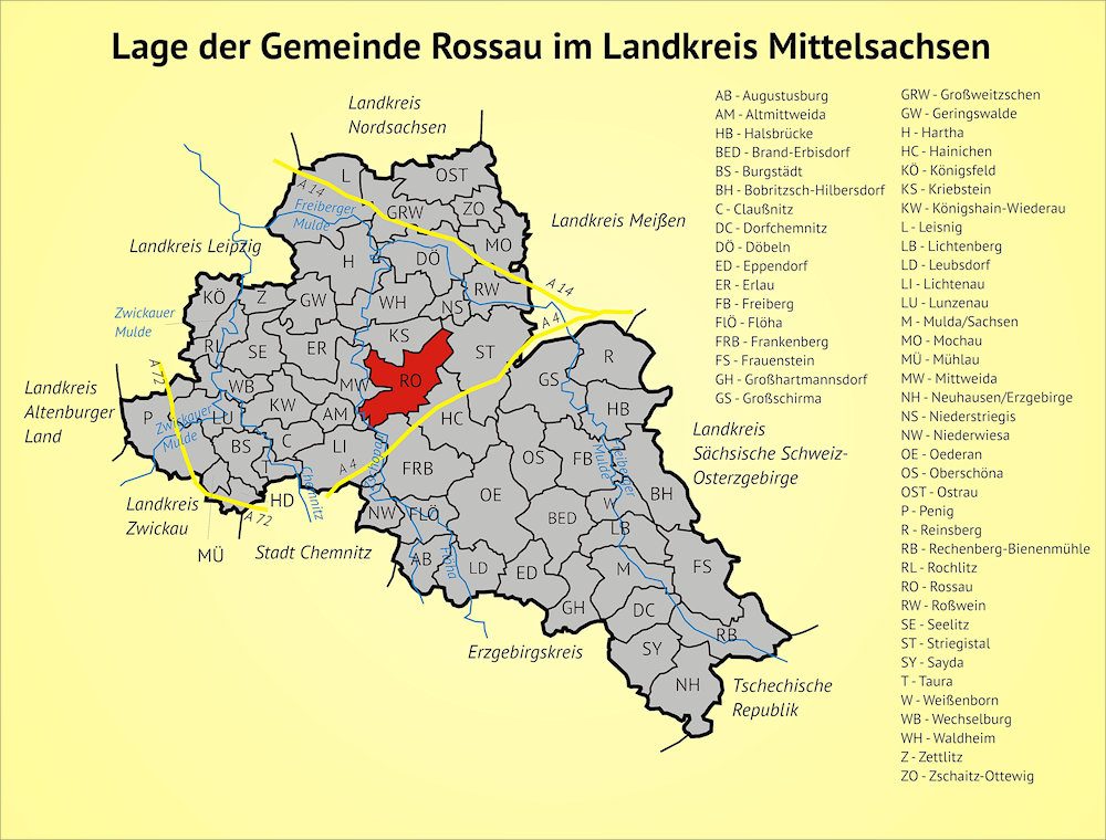 Rossau ist eine Gemeinde in der Mitte des Landkreises Mittelsachsen. Die Gemeinde Rossau setzt sich aus den folgenden Ortsteilen zusammen: