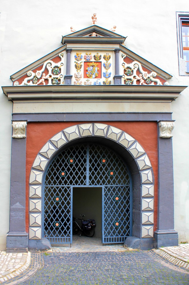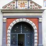 - Putzfassade, mehrere Erker und Zwerchhausgiebel mit Voluten, Bogenportal