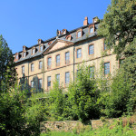 - Schloss: Putzfassade, Gewände, Gesimse und Balustergalerien aus Porphyr, Hofseite mit Freitreppe und Portal, Gartenseite mit Mittelrisalit,