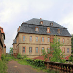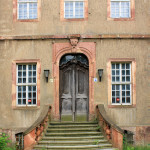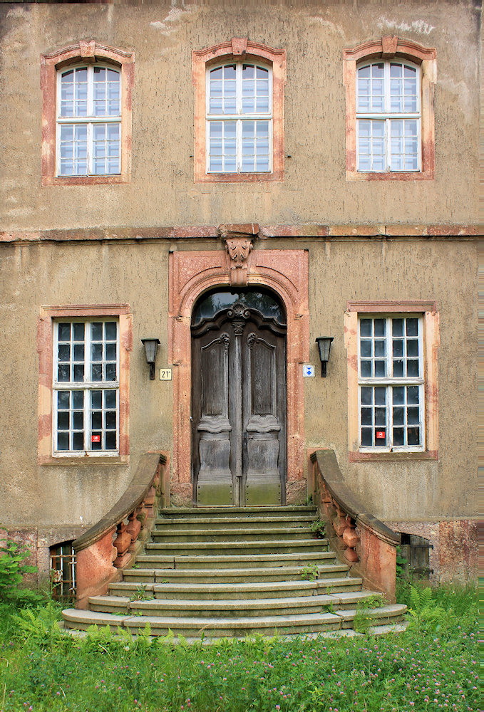 - Das dreiflügelige Schloss und die dreiflügeligen Wirtschaftsgebäude umschließen einen rechteckigen Hof. Das Schloss steht anstelle einer Burg.
