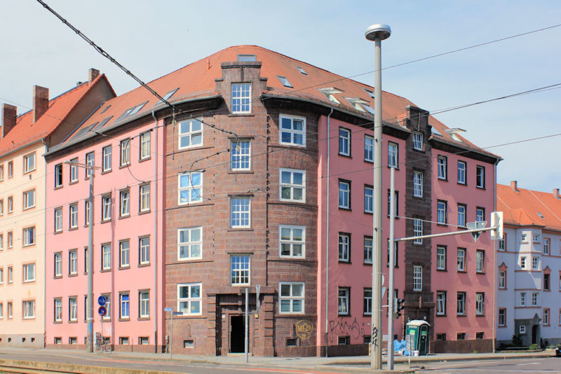 Das Wohnhaus Blochmannstraße 1 in Leipzig steht in geschlossener Blockrandbebauung zwischen Chausseehaus und Eisenbahnviadukt Eutritzsch.