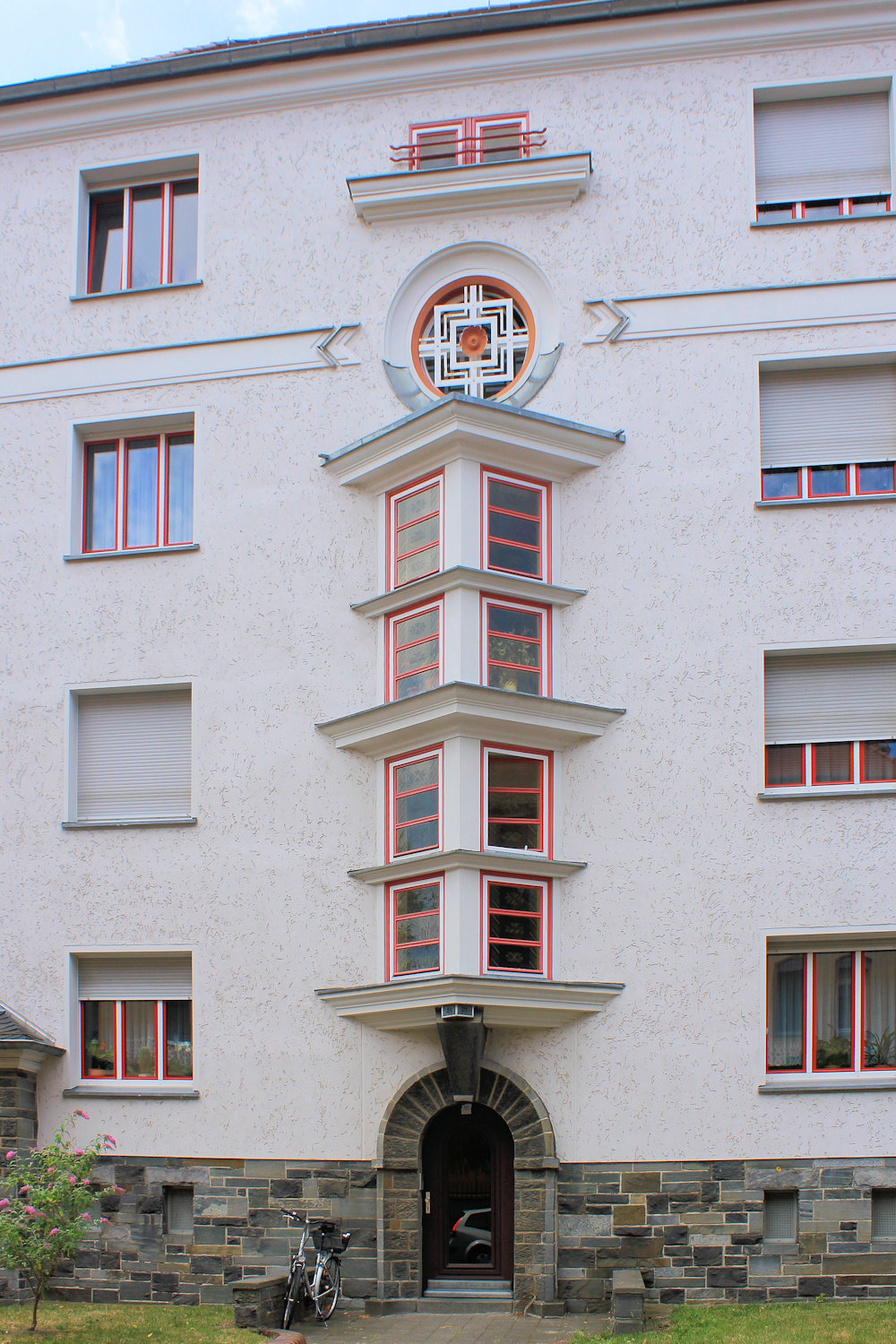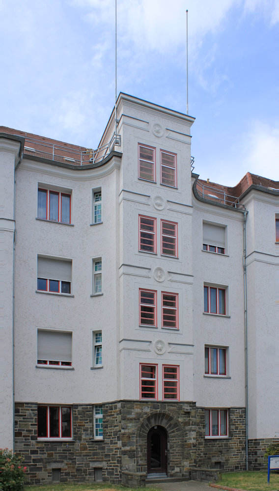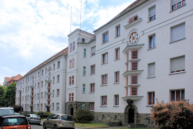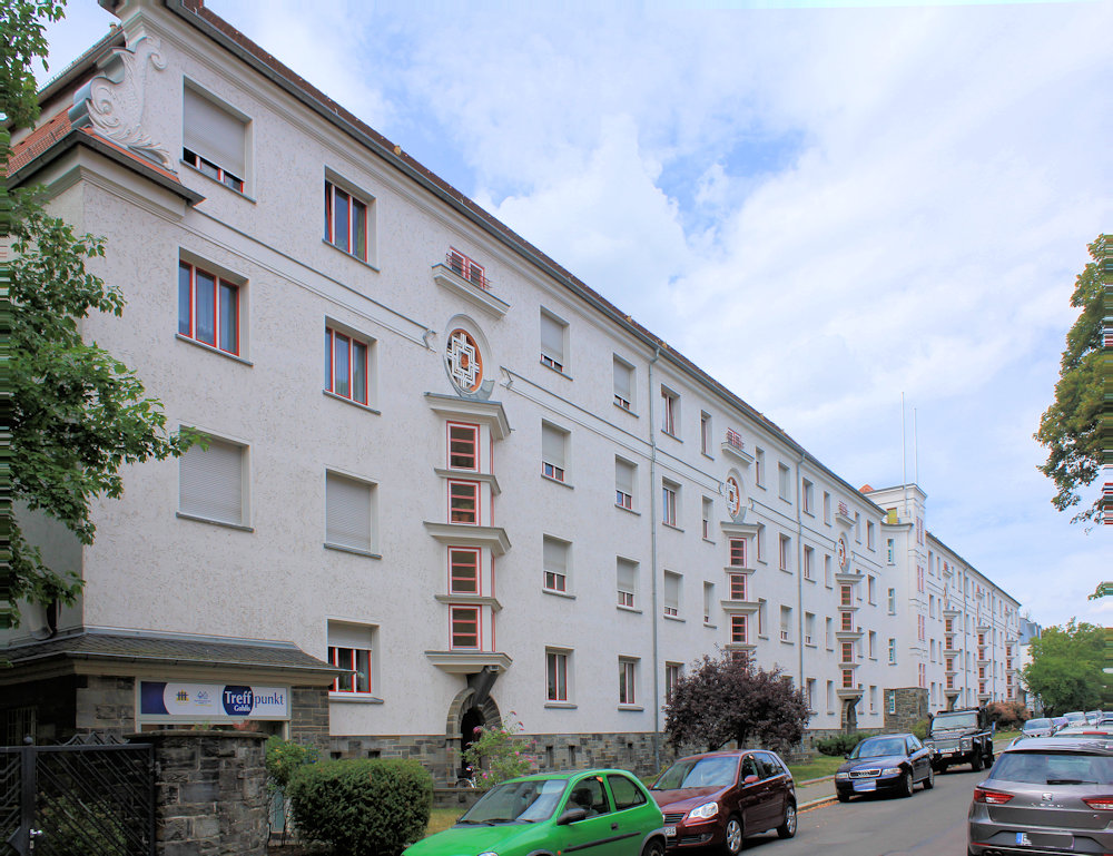 Die Wohnanlage Corinthstraße 21 bis 33 in Gohlis steht als freistehender Zeilenbau nahe der Versöhnungskirche Gohlis.