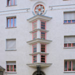 - Putzfassade, symmetrisch unterteilt, Putz-, Kunststein- und Natursteingliederungen, eingezogene Mitte mit turmartigem Risalit, dreieckige Treppenhauserker, kräftige Portale