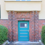 - Putzfassade, verklinkertes Sockelgeschoss, Klinkergliederungen an den Gebäudeecken, Treppenhausrisalite
