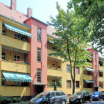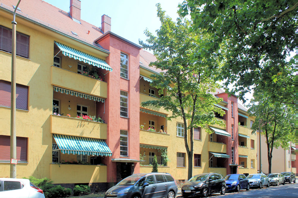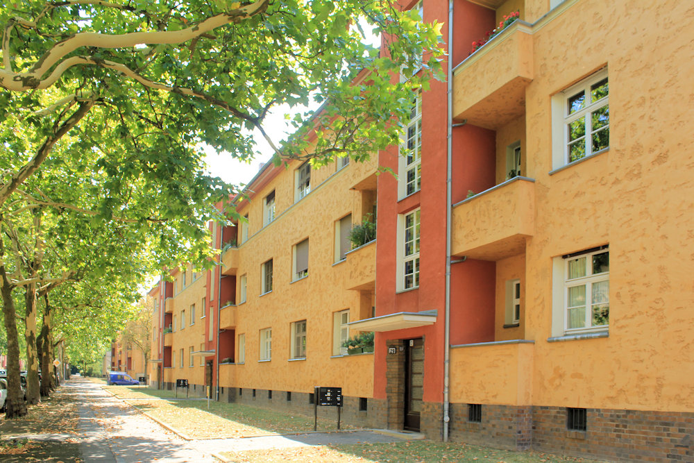 Die Wohnanlage Schönbachstraße 19 bis 38a in Stötteritz/Thonberg steht in Zeilenbauweise zwischen Güntz-Park und Völkerschlachtdenkmal.