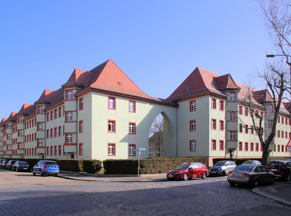 - einen Baublock einnehmende Wohnanlage aus vier Zeilenbauten, davon zwei mit Torbauten verbunden