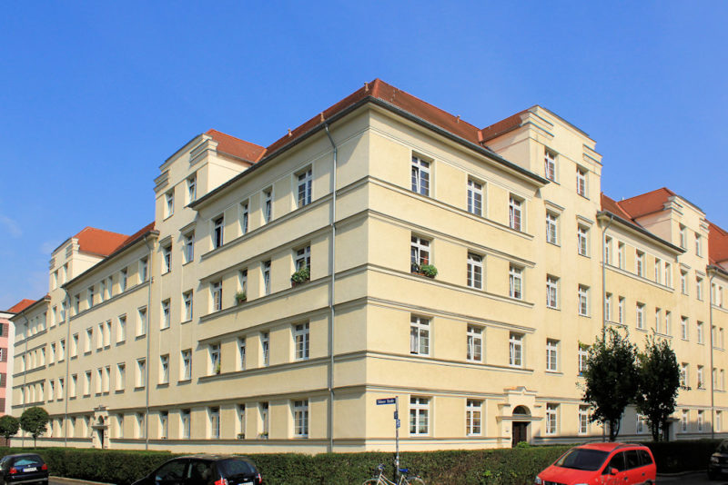 Die Wohnanlage Stünzer Straße/Friedrich-Dittes-Straße/Neumannstraße in Anger-Crottendorf steht in geschlossener Blockrandbebauung nahe dem Stünzer Park.