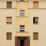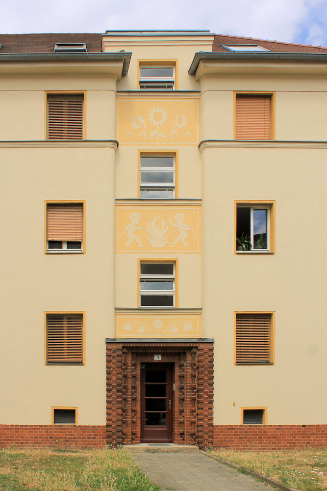- Putzfassade, Klinker- und Putzgliederungen, Treppenhausachsen mit Sgraffiti, Blumen und Putten mit Feuer in Anspielung auf die einstige Mieterschaft von Feuerwehrleuten
