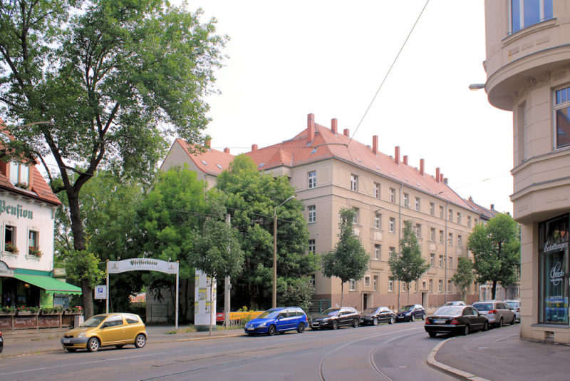 Das Wohnhaus Wurzner Straße 171 bis 173a in Sellerhausen-Stünz steht in Zeilenbebauung nahe der Emmauskirche.
