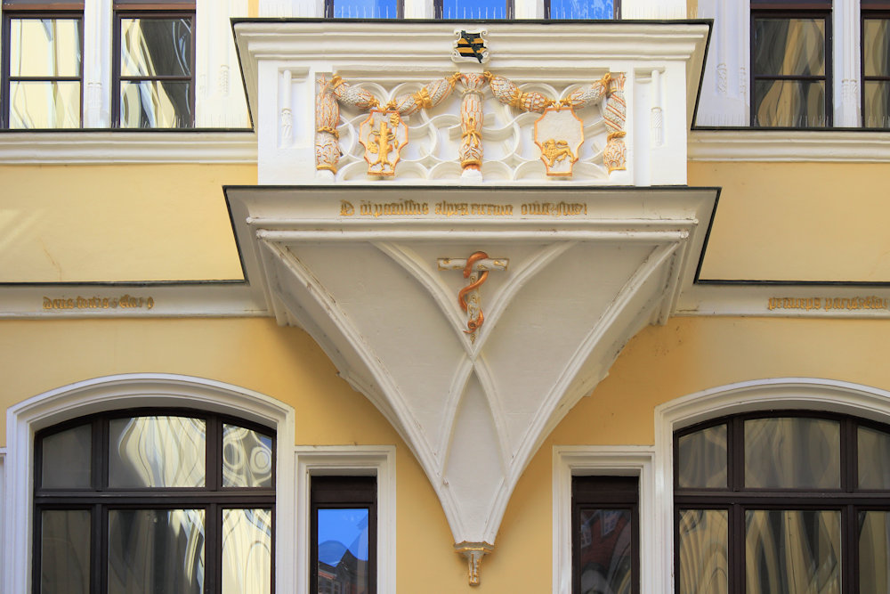Das zum Markt gewandte, schmale Haus schmückte ein reich verzierter Erker, der von einem Volutengiebel mit Türmchen gekrönt war. Der Konsolstein des Erkers weist mit seinen gekreuzten Rippen noch gotische Züge auf. Die Stabprofiel der Fenster hingegen wurden später auch von Hieronymus Lotter am Alten Rathaus in Leipzig verwendet worden. Die Renaissance hatte 1523 auch in Leipzig Einzug gehalten.